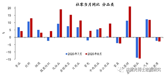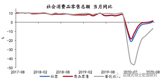 社零重回正增长,多数品类增速回升。8月社零同比为0.5%,年内首次由负转正;季调后的环比为1.25%,是2013年3月以来新高。受需求释放、基数回落带动,汽车零售同比保持在11.8%的高位;通讯器材、化妆品、办公用品、金银珠宝、家电等可选品明显反弹。此外,表征服务消费的餐饮收入降幅收窄至7%。近期高频和行业数据显示,服务消费(交通、住宿、餐饮、电影等)恢复有所提速,有望支撑居民消费继续回暖。不过,限额以上和限额以下社零增速缺口继续扩大,表明中小零售企业生产经营依然困难重重。