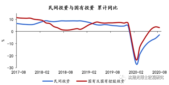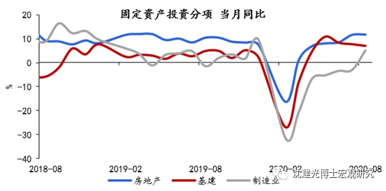 地产基建支撑内需,制造业投资是主要亮点。8月地产投资当月同比高达11.8%,其中施工面积高增、商品房销售强劲,而新开工出现回落;基建投资当月同比略降至7.0%,其中交运仓储投资增速明显回落,抵消了水利环境和公用事业的回升。地产、基建投资均高于去年同期水平,是内需的重要保障。值得关注的是,前期持续低迷的制造业投资当月同比大幅反弹至5.0%(年内首次转正),或由于近期内外需同步改善,企业利润快速反弹,投资意愿有所恢复;同时,民间投资与国有控股投资的分化也有所收敛。
