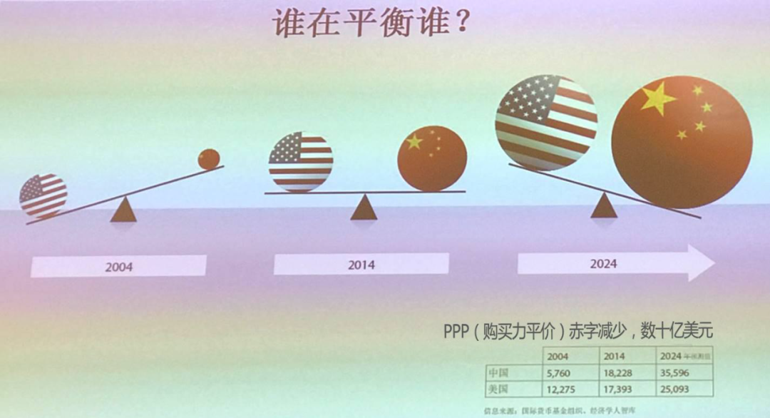 以格雷厄姆·艾利森教授(曾任里根总统美国国防部长特别顾问,哈佛大学肯尼迪政府学院“首任院长”)著作《注定一战》中的图为例,这张图是我2017年去哈佛商学院读书的时候艾利森教授上课时展示的,给我留下深刻印象。这张图是为美国联席会议的将军们讲中美两国关系时准备的,以简单方式展示中美两国未来发展趋势。艾利森教授给出最简单的理由是中国人更有效率。以哈佛大学为例,其校内查尔斯河上的一座桥已经维修10年,艾利森教授称如果明年来参观这座桥依然无法完成修缮,这就是美国人的效率。艾利森教授又问到北京三元桥的维修时间是多久,在座的88个同学说半年、一年,教授随后展示了一个视频,北京三元桥从拆到建用时48小时。这就是中国速度,所以中国更有效率。