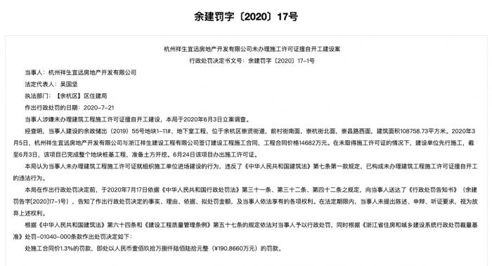 行政处罚决定书指出,经查明,当事人建设的余政储出(2019)55号地块1-11#、地下室工程,位于余杭区崇贤街道,前村街南面,崇杭街北面,崇昌路西面,建筑面积108758.73平方米,“2020年3月5日,杭州祥生宜远房地产开发有限公司与浙江祥生建设工程有限公司签订建设工程施工合同,工程合同价格14682万元。在未取得施工许可证的情况下,建设单位先行施工,截至6月3日,该项目已完成整个地块桩基工程,准备土方开挖。6月24日该项目办出施工许可证。”
