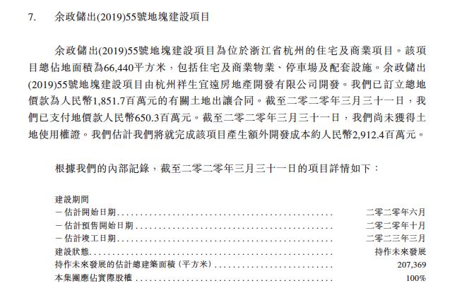 祥生于6月3日披露的招股书,对该地块亦有介绍:余政储出(2019)55号地块建设项目为位于浙江省杭州的住宅及商业项目。该项目总占地面积为66,440平方米,包括住宅及商业物业、停车场及配套设施。余政储出(2019)55号地块建设项目由杭州祥生宜远房地产开发有限公司开发。祥生已订立总地价款为人民币18.517亿元的有关土地出让合同。截至2020年3月31日,祥生已支付地价款人民币6.503亿元。截至2020年3月31日,祥生尚未获得土地使用权证。