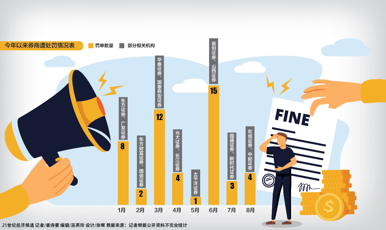 21世纪经济报道记者据公开信息不完全统计,今年以来截至9月16日,监管机构开出的券商罚单约50余张,已经超过2019年全年40余张的罚单数据。