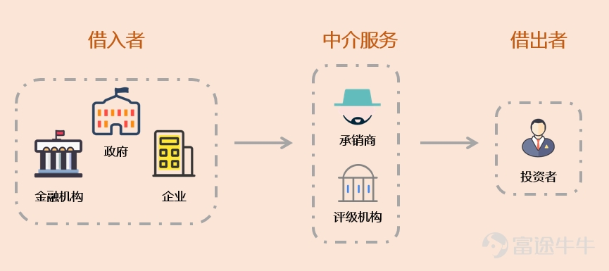 其实这也是债券市场的运行逻辑。债券本质就是政府机构或公司为了借钱而卖给投资人、带有利息的金融契约。在这过程中,政府、金融机构、企业等机构是资金的借入者;个人投资者是债券的借出者;而承销、评级机构则充当中介服务的角色。