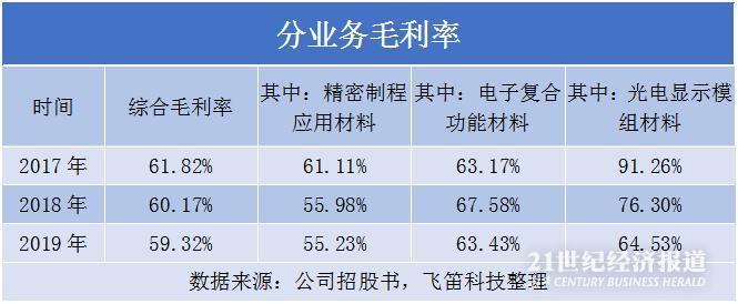 再来关注公司各业务的毛利率情况。从上表可以看到,公司的精密制程应用材料的毛利率逐年下降,由2017年的61.11%下降至2019年的55.23%,主要是因为公司该类产品的售价整体下降;电子复合功能材料的毛利率也存在一定波动,光电显示模组材料毛利率下滑非常明显,但目前占比还较小。