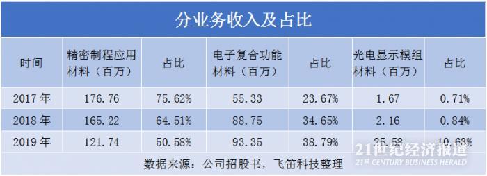 精密制程应用材料是一类对材料性能具有高要求的功能膜类产品,主要应用于苹果公司iPhone 产品制程及功能器件保护中。报告期内,公司的精密制程应用材料的收入逐年下降,占比也由2017年的75.62%下降至2019年的50.58%。公司解释主要原因是报告期内苹果公司iPhone 产品出货量下降,导致精密制程应用材料需求相应下降;同时行业竞争加剧,导致公司销售单价整体下降;此外,公司加大其他两块业务的投入和拓展力度,也使得精密制程应用材料订单承接能力有所下降。