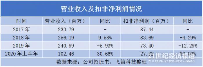 先来看世华科技整体的营收和净利润情况。2017-2019年,公司实现营业收入2.34亿元、2.56亿元和2.41亿元,公司的营收表现不稳定,在2019年同比出现负增长。同期公司的扣非净利润为8744万元、8369万元和7340万元,净利润同比2018年和2019年分别下降4.29%和12.29%,对比营收,净利润的下降幅度更大。