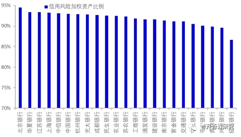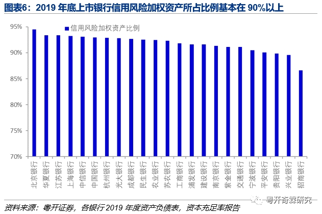 在现实情况中,风险加权资产里占比最高的是信用风险加权资产,各大上市银行基本都在90%以上(图表6)。所以一般情况下,我们所说风险加权资产主要指信用风险加权资产。