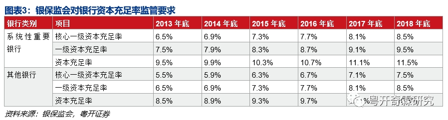 对这三项的考核,银监采取的是分类且设置过渡期的形式。银监先将银行分为系统性重要银行和其他银行两大类,然后对不同类别的银行设置不同的监管要求,并规定在2018年底逐步达标。具体如图表3所示。