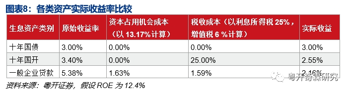 同样的,在考虑资本占用机会成本以及税收成本后,10年国债(设为3.0 %)和10年国开(设为3.40%)的收益率分别为3.0%和2.55%。从实际收益率来看,相比于企业贷款,债券类的资产反而是占有优势的。