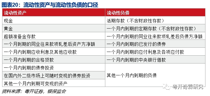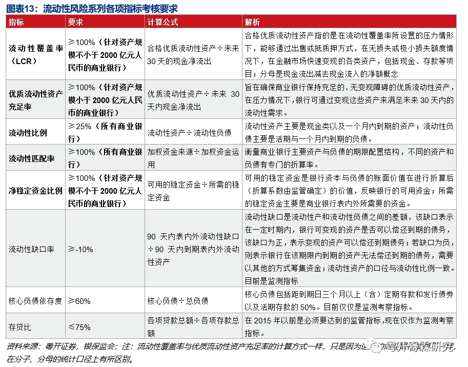 在过去几年里,银保监会对商业银行流动性的监管力度不断上升,相应的流动性监管指标也在不断更新,以银保监会2018年发布的《商业银行流动性风险管理办法》为核心文件,目前银保监会流动性的监管考核指标主要包括流动性覆盖率、优质流动性资产充足率、流动性比例、流动性匹配率、净稳定资金比例这五个指标,另外规定流动性缺口率、核心负债比例、存贷比等指标为监测指标。