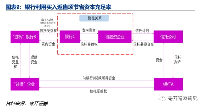比如说银行C想要给企业放贷,那么它先让银行A出资,通过信托公司发一笔信托贷款,然后再引入一个过桥企业,让A银行将信托受益权转让给银行B,让银行B担当过桥银行,最后再由银行B再将信托受益权转让给银行C,由银行C真实出资。