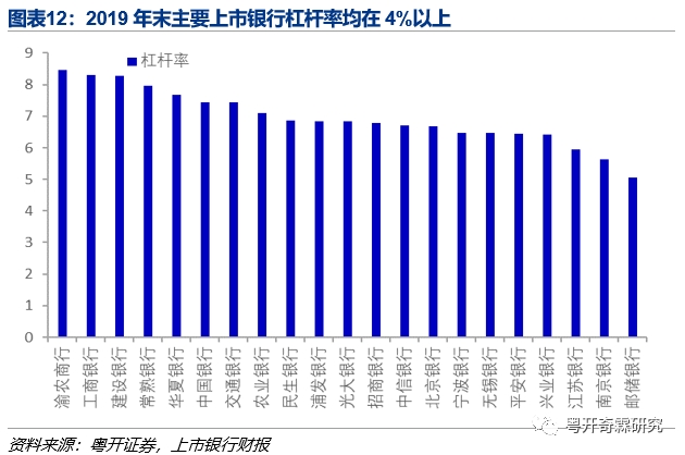 从现有各家银行的实际情况来看,杠杆率这一项并不会对银行造成过多影响,银监要求的标准是不低于4%,但2019年末各家上市银行的杠杆率水平均在4%以上,银行并没有太大的监管考核达标压力。