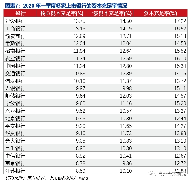 从2020年一季度上市银行的财务报表所披露的资本充足率情况看,银行的资本充足率水平基本都在监管考核要求之上。