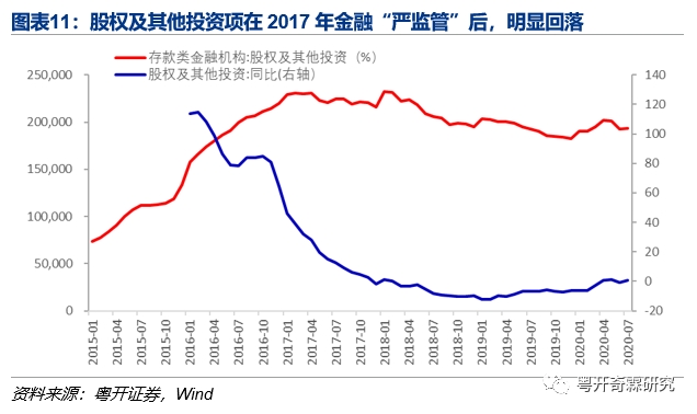 但随着2016年四季度金融严监管模式开启,监管层打击金融同业乱象,银行利用委外形式进行监管套利的行为有所收敛,股权及其他增速的同比增速开始大幅回落。