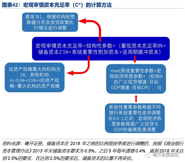 在银行自身资本充足率在短期内无法发生变化的条件下,银行要想达标,关键就在于宏观审慎资本充足率(C*)的大小了。它的计算比较复杂,与机构特质、宏观经济状况、广义信贷增速等相挂钩,且有弹性调整空间,具体计算方法如下图所示。