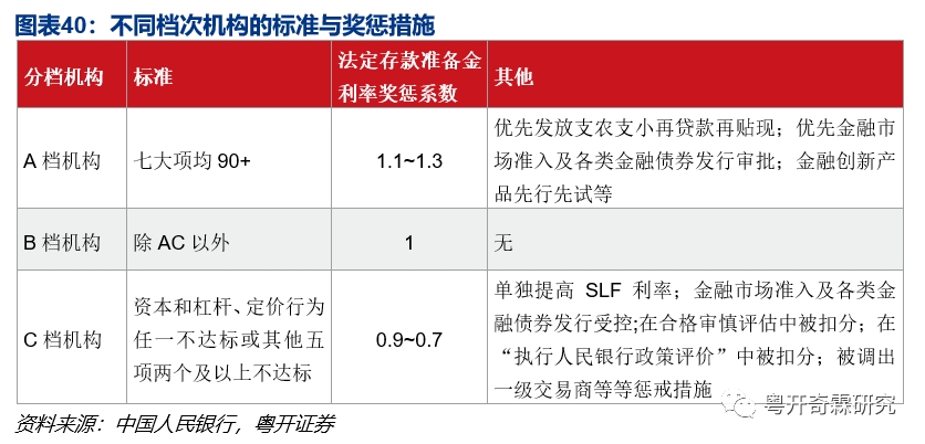 对于 C 档机构,央行不仅实施约束性与惩罚性的法定准备金利率,还限制金融市场准入及各类金融债券发行,甚至取消一级交易商的资格,此外如果银行流动性紧张,需要向央行借钱,利息也会收的比别人高(常备借贷便利SLF 利率)。