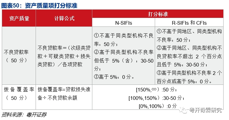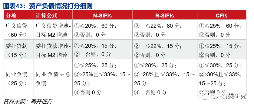 这里需要注意一点,就是央行对金融机构进行了层次划分,并且对应不同的打分标准。央行根据银行重要性的不同而划分为三个层次:全国性系统重要性机构(N-SIFIs)、区域性系统重要性机构(R-SIFIs)、普通机构(CFIs)(具体每一层次包括哪些机构,见图表44)。