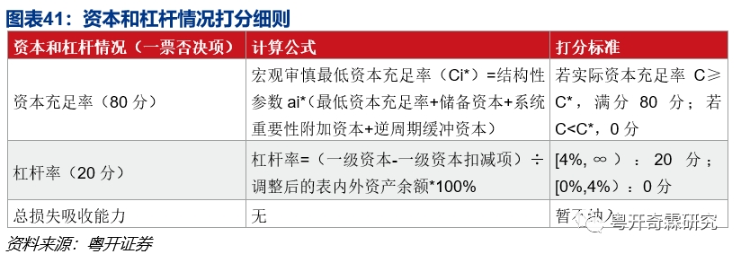 这一项考察三个指标:资本充足率、杠杆率和总损失吸收能力。杠杆率是银保监会监管指标,只要高于4%就能拿满分,上面我们已经做过相应的阐述,从2020年一季报的数据来看,银行在这一项基本都能获得满分20分。总损失吸收能力属于巴塞尔IV研究的内容,在相关管理要求明确前,该指标暂不适用。