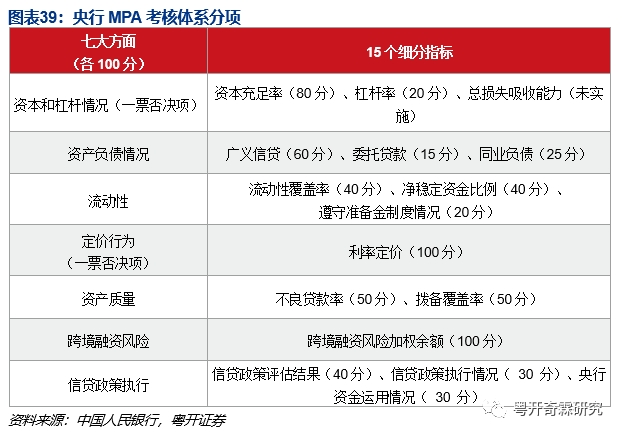 MPA考核实行打分制。它包含资本/杠杆情况、资产负债情况、流动性、定价行为、资产质量、外债风险以及信贷政策执行7大项,每一项满分100,央行根据每一项下的15个细分项,进行打分。