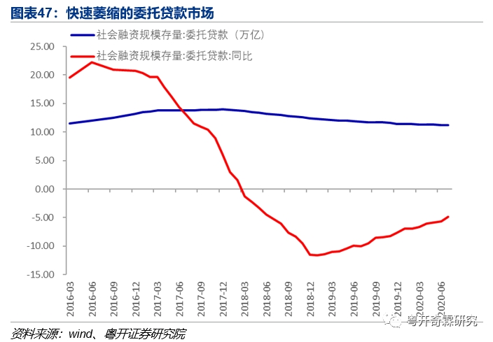 受严监管的影响,可以看到2017年之后市场上委托贷款同比增速快速下滑,并且在管理办法正式落地后进入了负增长区间,一直到现在委托贷款的规模都在不断的下滑,可以说目前,银行在委托贷款上并不存在任何监管考核的压力。