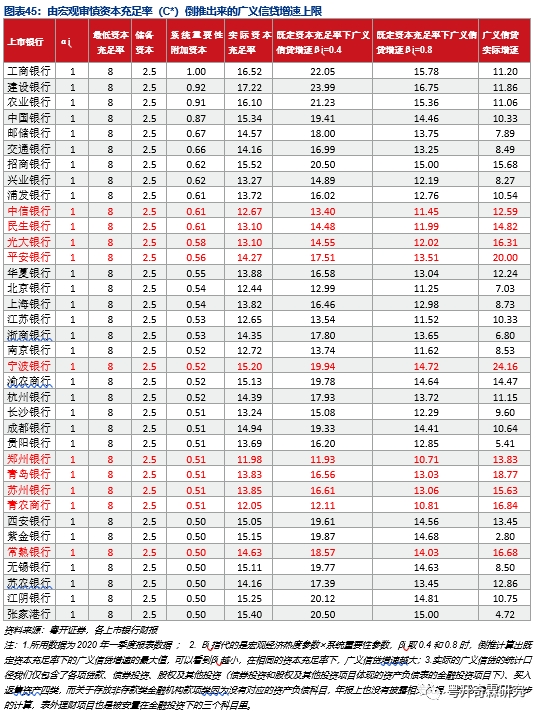 我们利用上市银行的资产负债表做了一个简单测算,如下图所示。从结果来看,有不少银行实际广义信贷的增速超过或接近了这个隐性上限,银行在这一项上有着较大的考核压力。