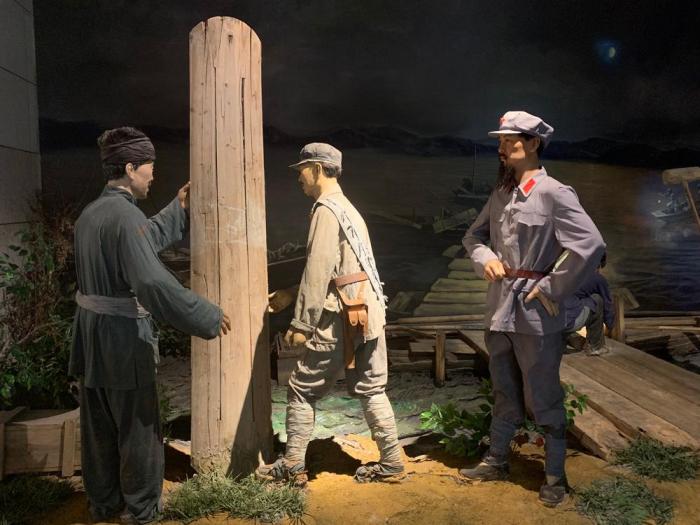 △中央红军出发纪念馆再现于都老人将自己的棺木捐给红军搭浮桥的场景。(总台央视记者郭晗光拍摄)