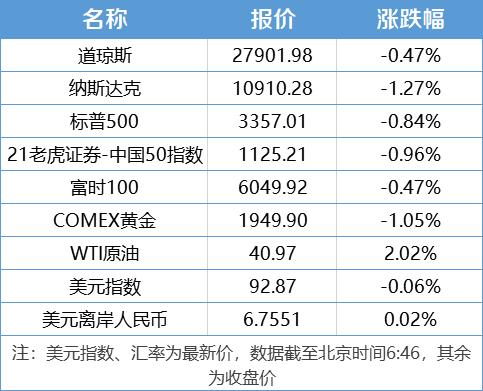 个股方面,特斯拉跌超4%,总市值跌破4000亿美元。美国大型科技股全线走低,苹果跌1.6%,亚马逊跌2.25%,Facebook跌3.3%。中概股方面,前程无忧接到私有化要约,股价收涨逾16%。