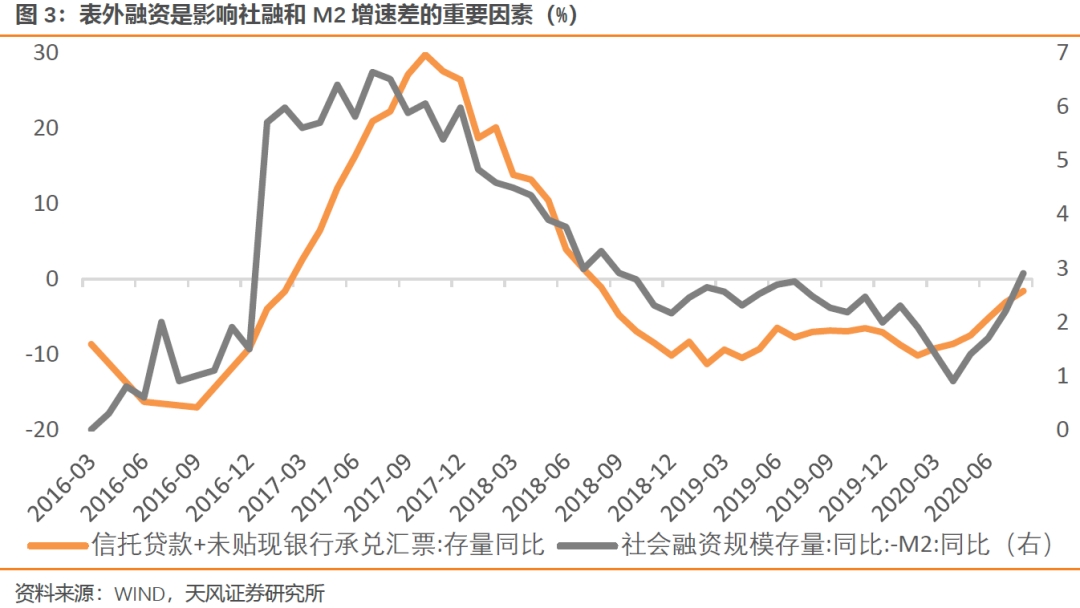 一是表外融资需求旺盛,信托贷款和未贴现票据存量增速持续回升,从今年2月的低点-10.2%升至8月的-1.6%。这一过程中出资者的存款转化为融资企业的存款,没有派生M2但会计入社融。