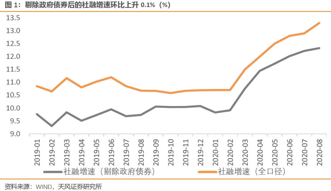 一是政府赤字的大幅扩张。政府债券净融资规模高达1.38万亿,同比多增8700亿,是推动社融高增长的最重要因素之一。8月存量社融同比增速从7月的12.9%升至13.3%,上升0.4%;剔除政府债券后,同比增速从7月的12.2%升至12.3%,上升仅0.1%。