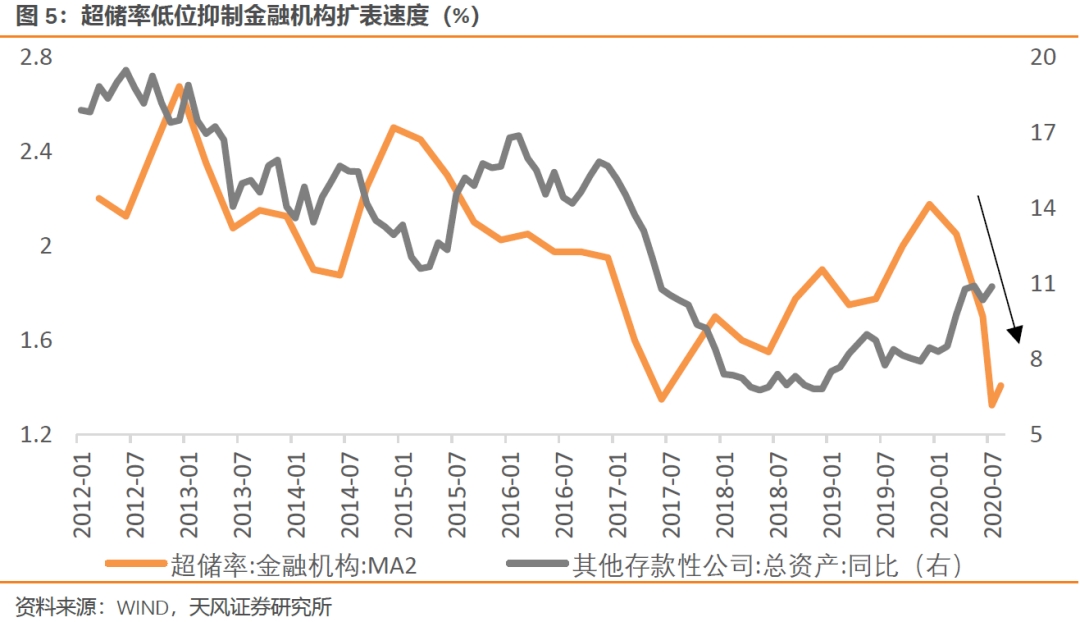 往后看,两项指标均指向信贷增速出现回落的概率更高。一是流动性,经历了5月以来流动性环境从宽松到紧平衡的变化后,信贷增速可能滞后1-2个季度出现回落;二是超储率,6月超储率超季节性降至1.6%,7月为1.1%,8月保持在1.1%,9月MLF超额续作4000亿后可能恢复到1.3%附近。移动平均来看,超储率年初以来经历了一次快速回落,也将对后续金融机构扩表形成抑制。