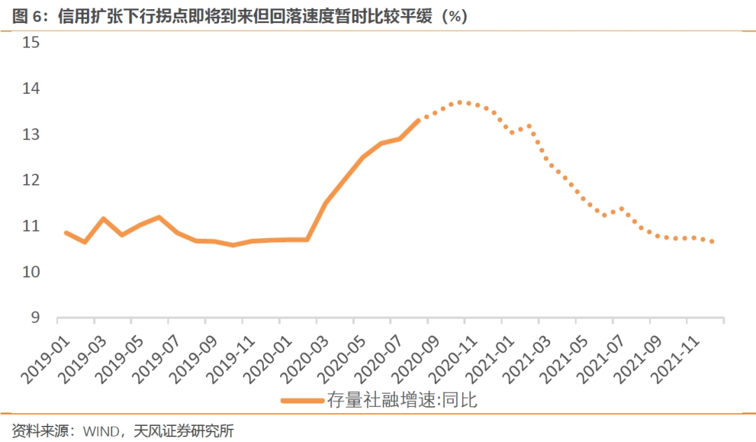 明年3月开始,如果政策环境继续保持平稳,受基数快速上升和财政赤字难以较今年继续明显扩张的影响,社融增速可能开始快速回落,至年底可能回到10%-11%的水平。