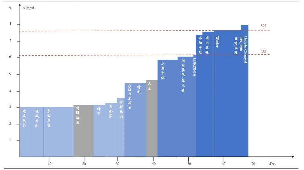 金属硅及硅芯属于原材料,各家采购成本差距不大。因此,可变成本的关键在于电力、蒸汽和人工三项。而电力、蒸汽的生产成本主要是靠煤炭(四川水电也有价格优势)。因此,生产基地设在四川和内蒙的通威股份,就拥有了行业最低的成本优势。