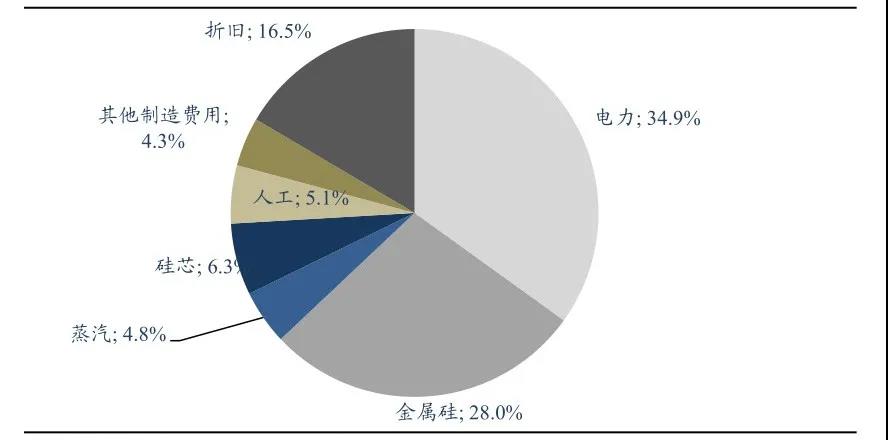 对多晶硅料环节来说,主要由电力、金属硅、折旧、硅芯、人工和蒸汽组成。其中,可变成本主要由金属硅、硅芯、电力、人工及蒸汽构成。