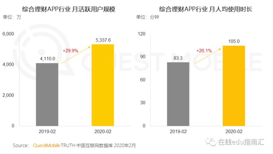 国内app数据服务商Questmobile在今年初的报告,呈现了“越来越广泛受众使用理财app”的数据变化。综合月活跃用户同比去年增长29%,平均使用时长也同比增加26%。