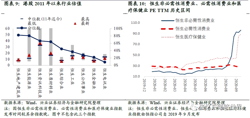 恒生医疗保健业(88.6倍)、恒生必需性消费业(28.2倍)、恒生非必需性消费业(96.3倍)