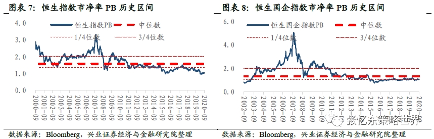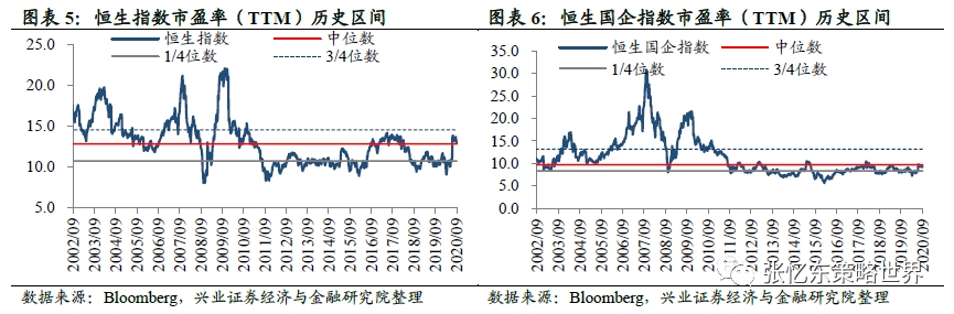 截至9月18日,恒指预测PE(彭博一致预期)为12.8倍,处于2005年7月以来的中位数和3/4分位数之间;恒生国指预测PE为9.5倍,处于2005年7月以来的1/4分位数和中位数之间。