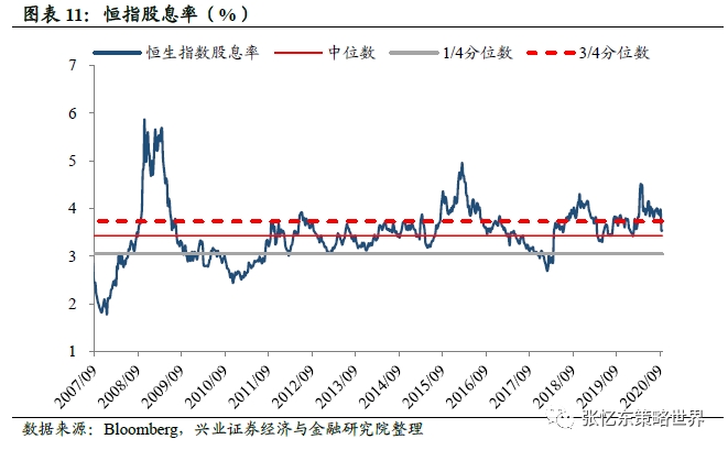 当前恒生指数的股息率为3.54%,高于上周的3.53%,处于2006年9月以来的中位数和3/4分位数之间。