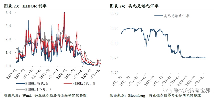 货币市场利率:截至9月18日,相较于上周五,本周HIBOR隔夜利率上升3bp至0.08%,7天利率上升5bp至0.20%,1个月利率上升7bp至0.47%。