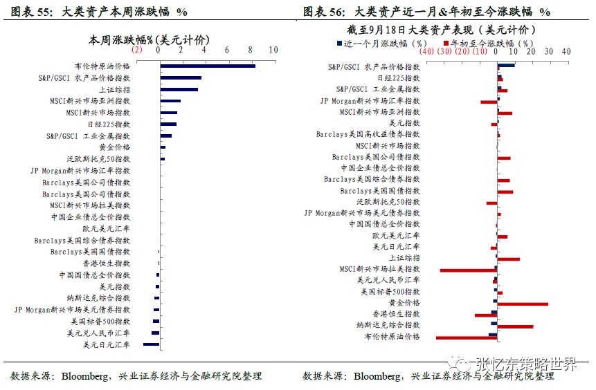 4) 大宗商品:原油表现优于农产品、工业金属和黄金。本周布伦特原油价格上涨8.3%,黄金价格上涨0.5%;