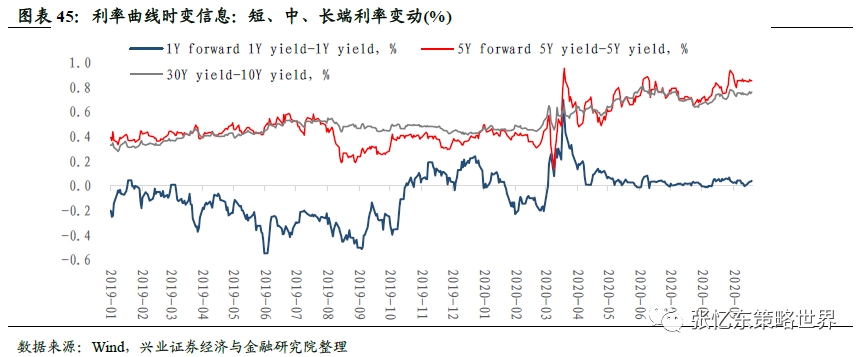 (注:短期货币政策预期,即1Y forward 1Y yield-1Y yield,指的是1年后的1年期国债到期收益率与当前时点1年期国债到期收益率的差,反映了短期(1年期)货币政策预期。同理,5Y forward 5Y yield-5Y yield(中期增长和通胀预期)指的是5年后的5年期国债到期收益率与当前时点5年期国债到期收益率之差,反映中期增长和通胀预期。)