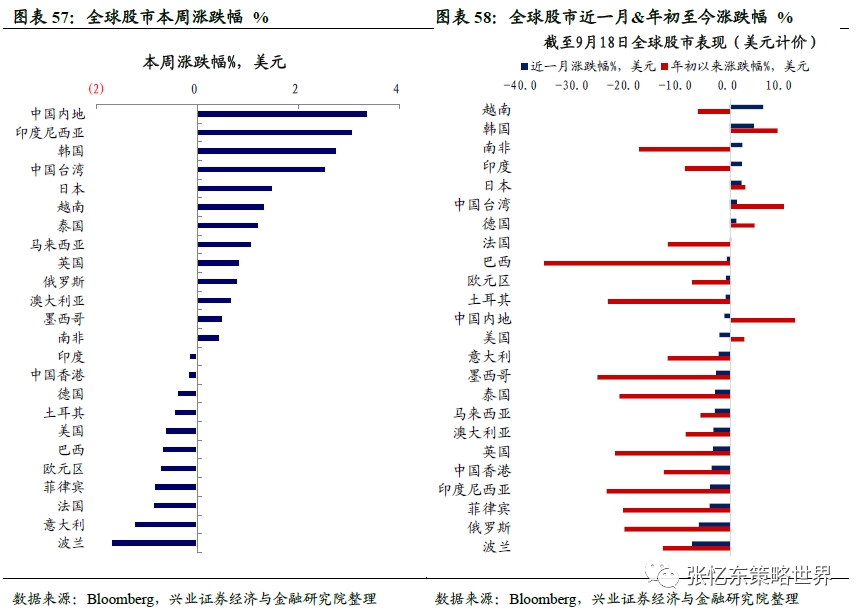 2) 股票市场:本周中国内地(上证综指)(涨3.4%)、印度尼西亚(涨3.1%)和韩国(涨2.8%)领涨,波兰(跌1.7%)、意大利(跌1.3%)和法国(跌0.9%)领跌;