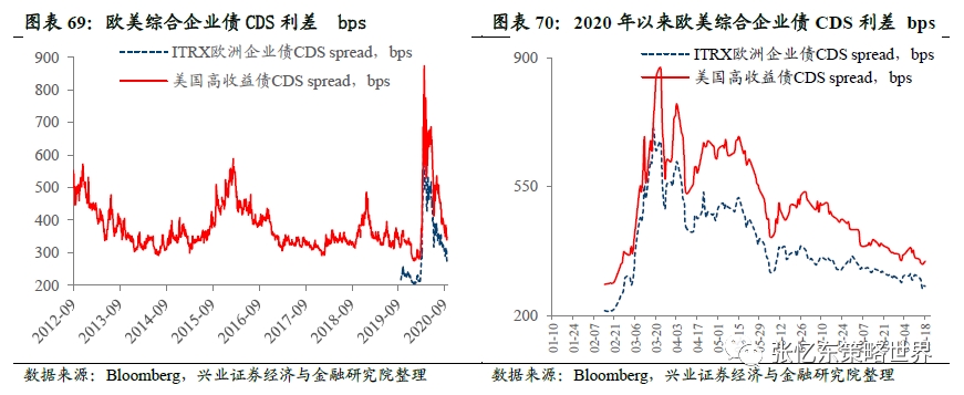 欧美综合企业债CDS利差:相较于上周收盘,欧洲企业债CDS下降30.9bps至279.4bps;美国高收益债CDS下降10.4bps至347.5bps。