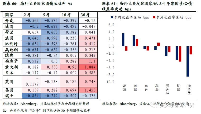 3) 债券市场:本周,海外主要发达国家/地区中,仅英国和美国的10年期国债收益率上升,意大利10年期国债收益率下跌8.5bp,美国10年期国债收益率上升3bp;