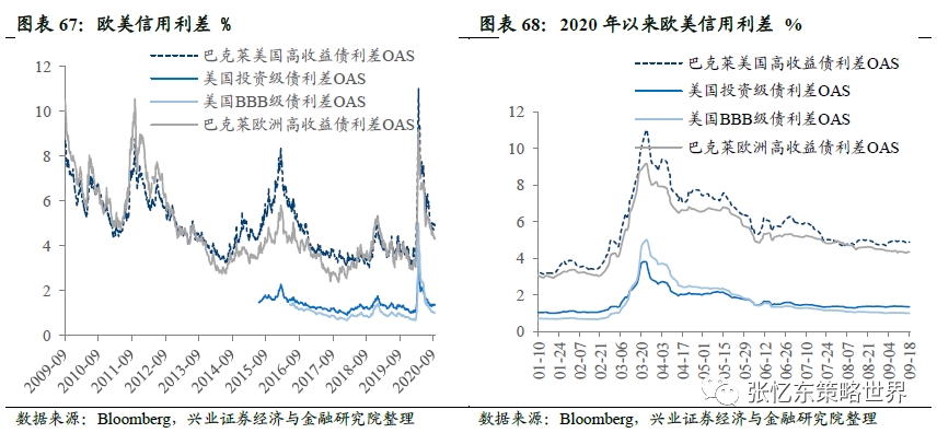 欧美企业债信用利差。截至9月18日,相较于上周收盘,巴克莱美国高收益债利差OAS下降6bp至4.9%,美国投资级债利差OAS下降3bp至1.4%,美国BBB级债利差下降2bp至1.0%,巴克莱欧洲高收益债利差OAS下降3bp至4.4%。