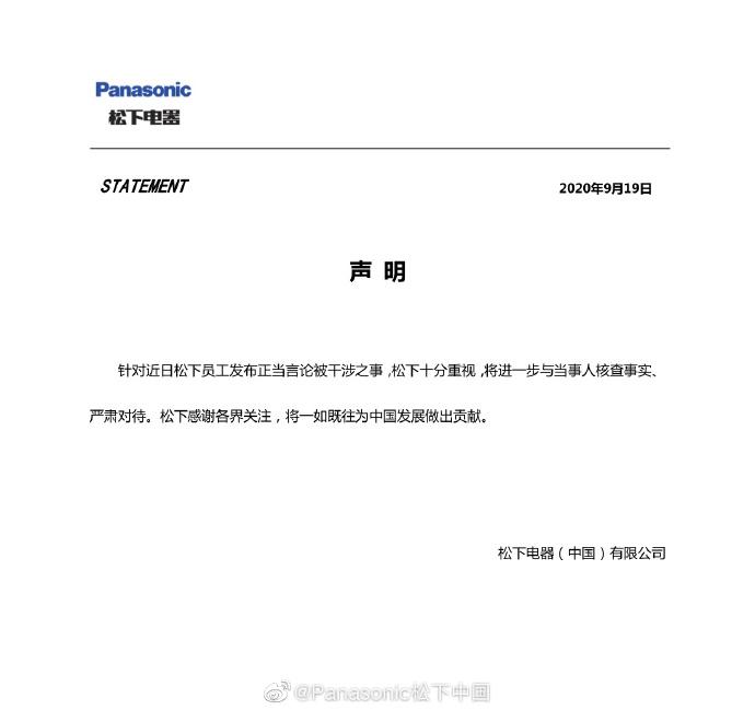 9月19日下午,@松下中国 发布微博称,针对近日松下员工发布正当言论被干涉之事,松下十分重视,将进一步与当事人核查事实、 严肃对待。松下感谢各界关注,将一如既往为中国发展做出贡献。
