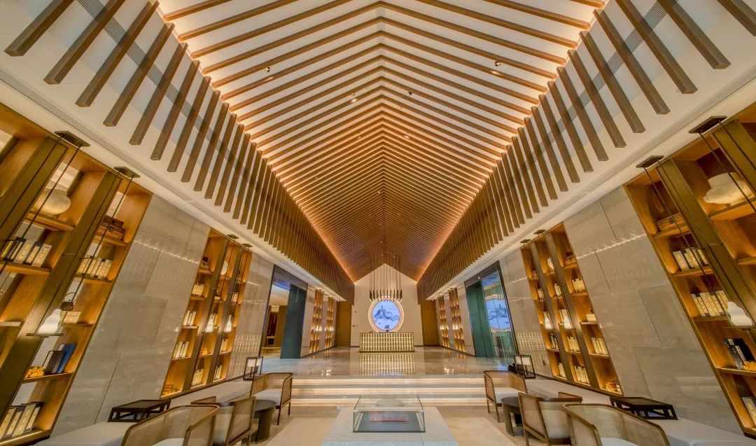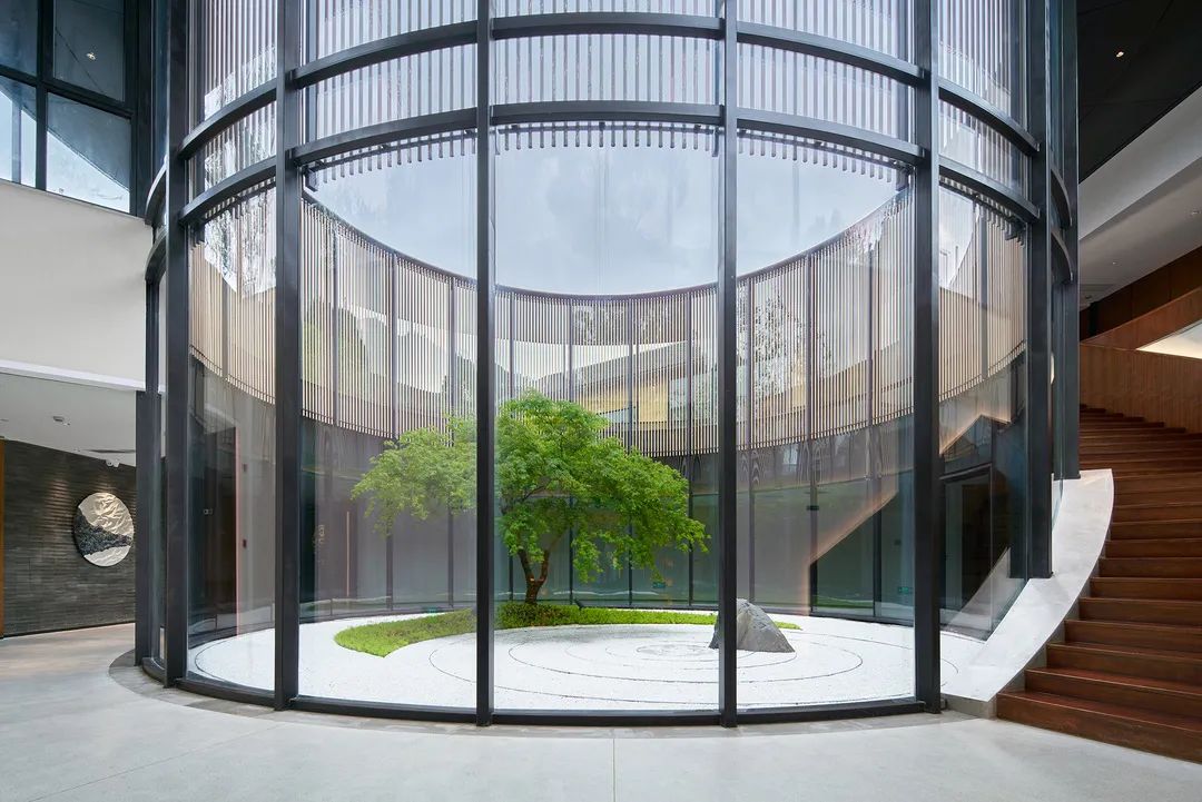 酒店内部则采用了经典的灰白色调,中庭的圆形设计宛如一幅巨大的太极八卦图,在现代化的设计之中融入了一丝古朴的韵味。