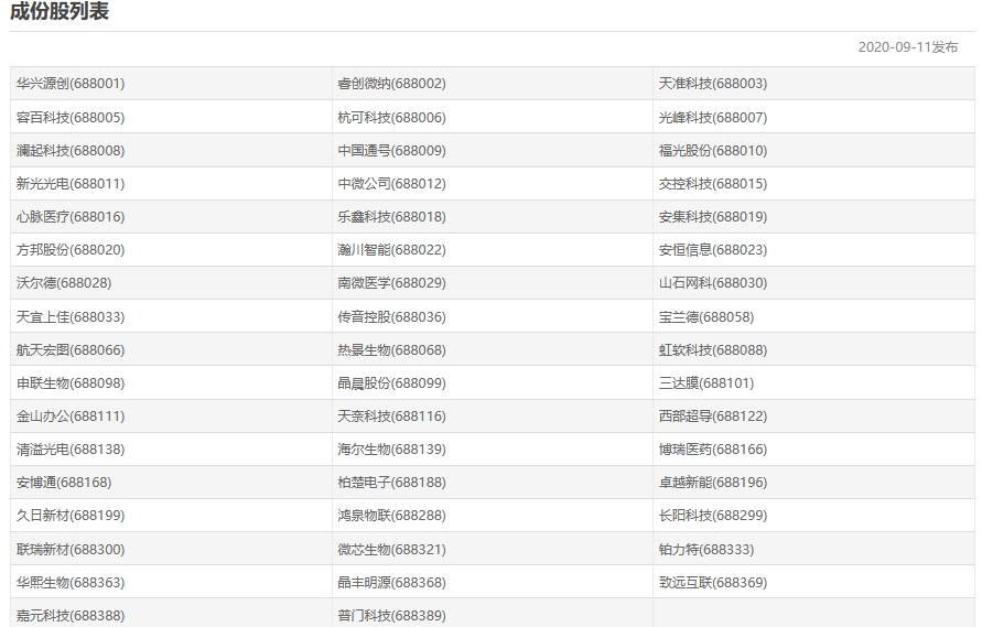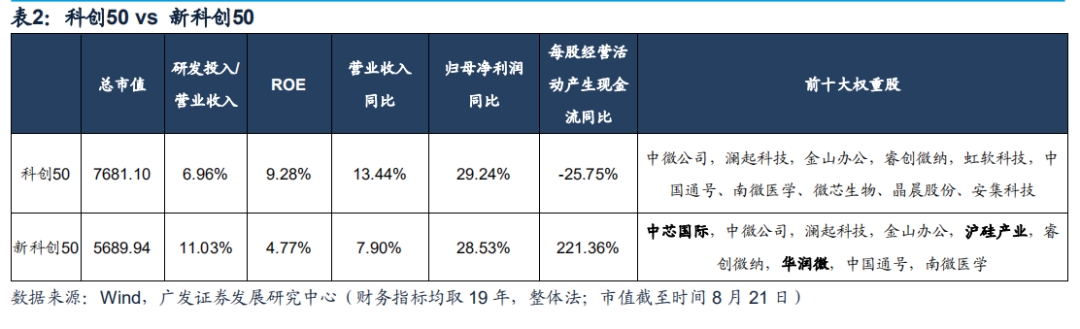 广发证券分析师倪赓8月27日报告以2020年8月21日作为考察日(去除当日上市企业),上市满1月,剔除科创板过去一年日均成交金额排位后10%企业,并选取过去一年日均总市值前50名企业构成“新科创50”,前十大权重股分别为:中芯国际,中微公司,澜起科技,金山办公,沪硅产业,睿创微纳,华润微,中国通号,南微医学。