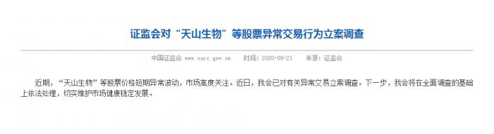 近期,“天山生物”等股票价格短期异常波动,市场高度关注。今日,证监会称已对有关异常交易立案调查。下一步,我会将在全面调查的基础上依法处理,切实维护市场健康稳定发展。