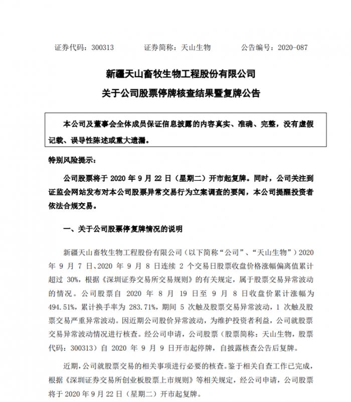 8月以来,天山生物(300313.SZ)涨幅遥遥领先,接近550%,期间多次发布股价异常波动公告。