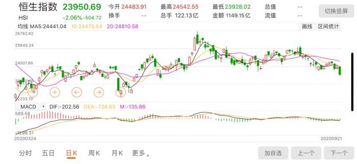 港股恒生指数高开低走,午后失守24000点,为6月15日以来首次,最终收跌2.06%报23950.689点,创7月24日以来最大单日跌幅。